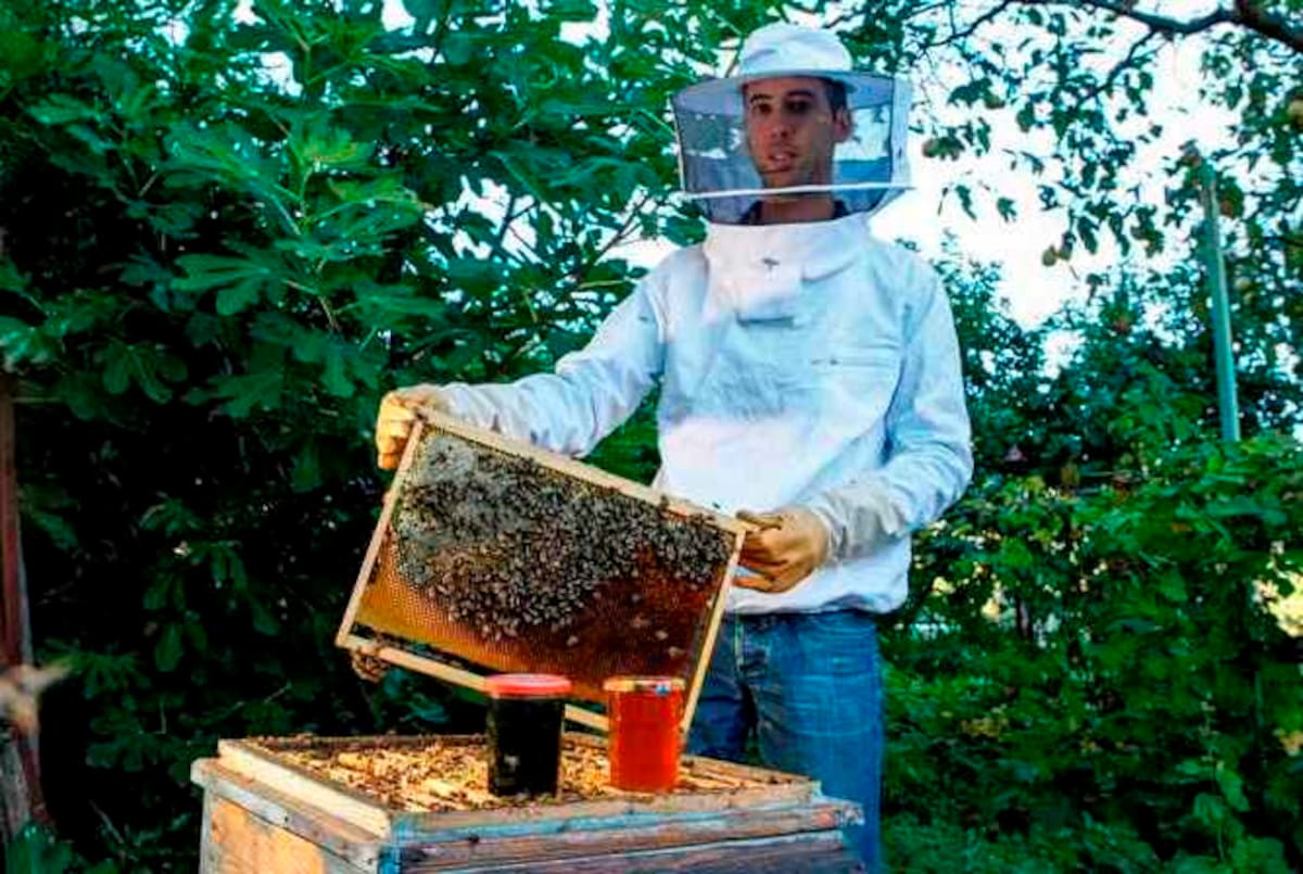 Maxime Favier, un apicultor aficionado, muestra un tarro de miel de color verde producida por las abejas de una colmena de Bernin, cerca de Grenoble (Francia), a mediados de septiembre. Los productores de la zona creen que el color se debe a que las abeja