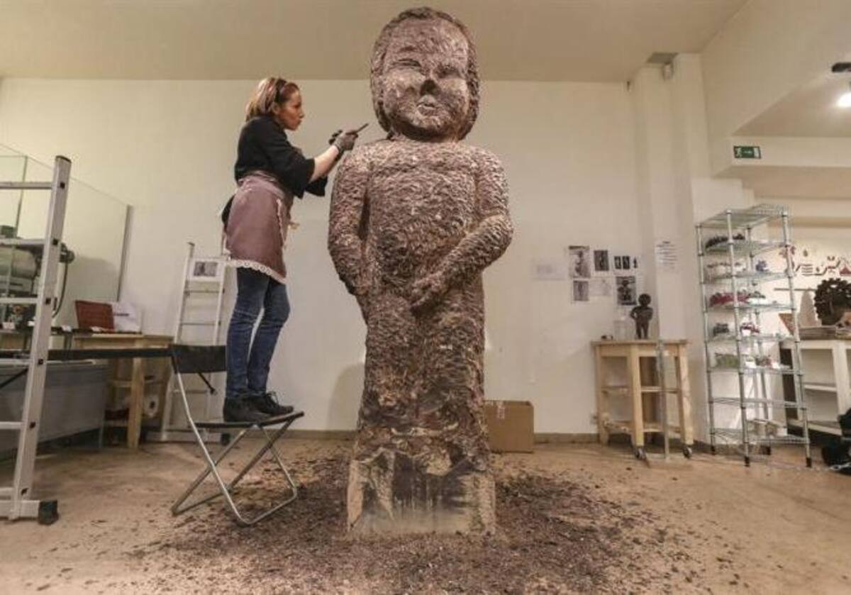 La escultora francesa Stephanie Dewitte talla una estatua de chocolate que representa al Manneken Pis, uno de los principales símbolos de Bélgica, en la chocolatería Zaabar de Bruselas, el pasado 6 de diciembre. La estatua, de 2,5 metros de alto, está hec