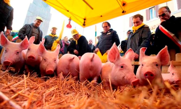 Un grupo de ganaderos italianos protesta en Roma, frente al Parlamento, el pasado 5 de diciembre, porque la venta fraudulenta de embutidos 'Made in Italy' les está llevando "a la ruina".