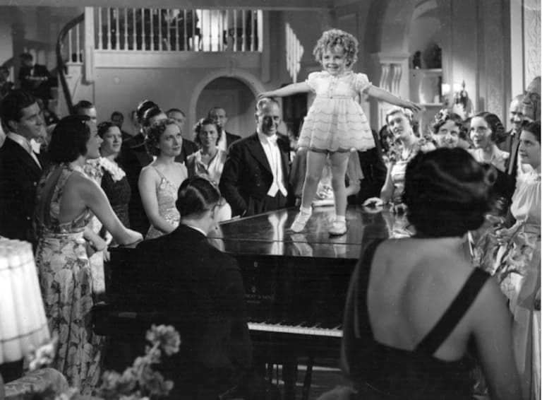 La pequeña actriz baila en una tapa del piano ante una multitud en la película 'Little Miss Somebody' (1938)