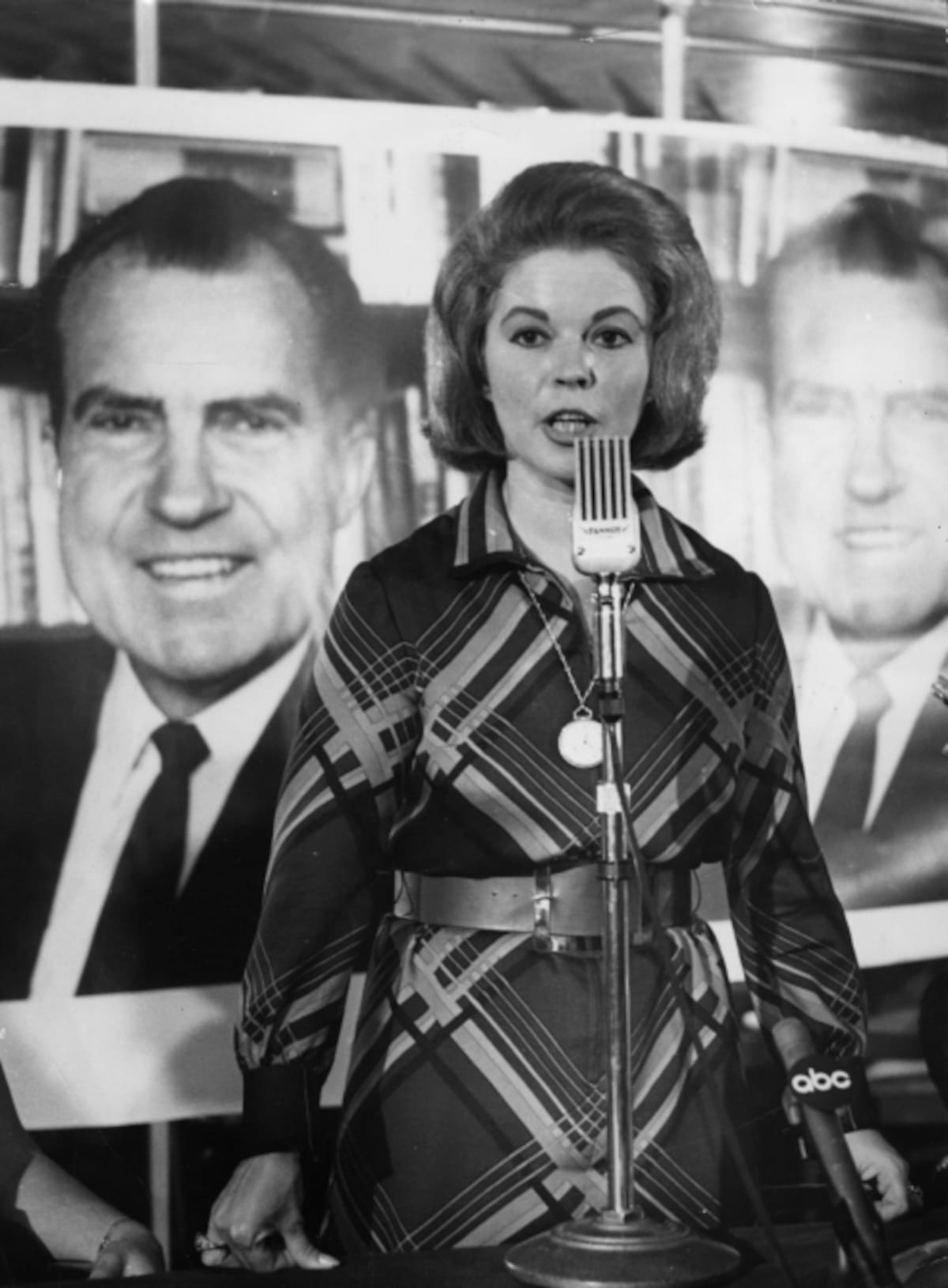La ex estrella infantil estadounidense habla delante de un cartel de Richard Nixon en las elecciones al Partido Republicano