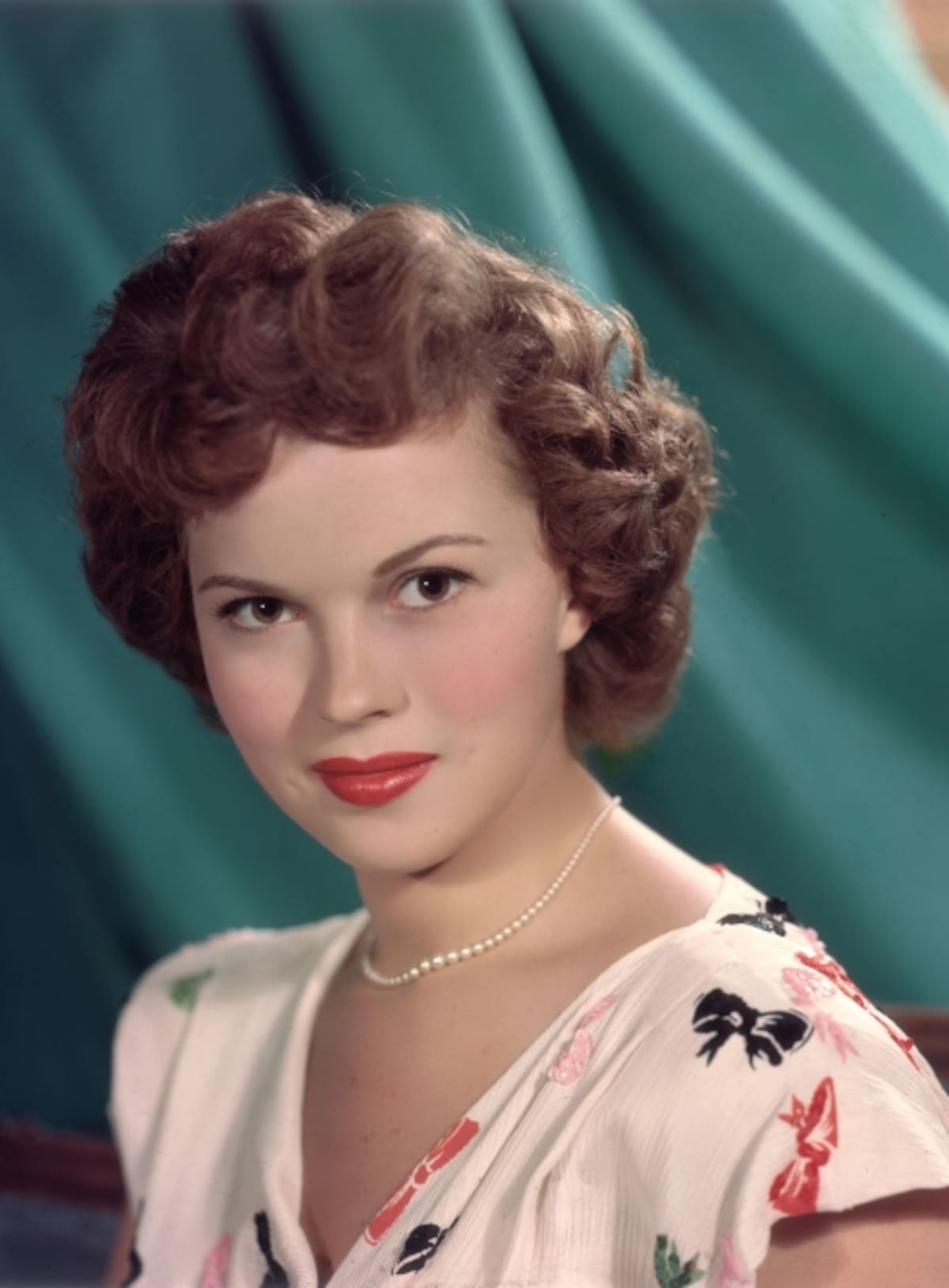 Retrato de estudio de la actriz estadounidense Shirley Temple, frente a un telón de fondo verde