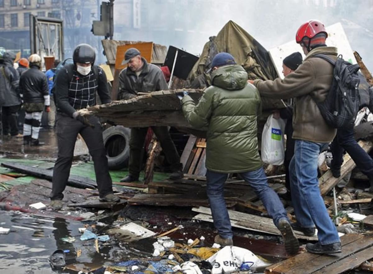 Manifestantes opositores al gobierno ucraniano refuerzan una barricada en el centro de Kiev, Ucrania, durante los enfrentamientos con la policía antidisturbios hoy, miércoles 19 de febrero de 2014.