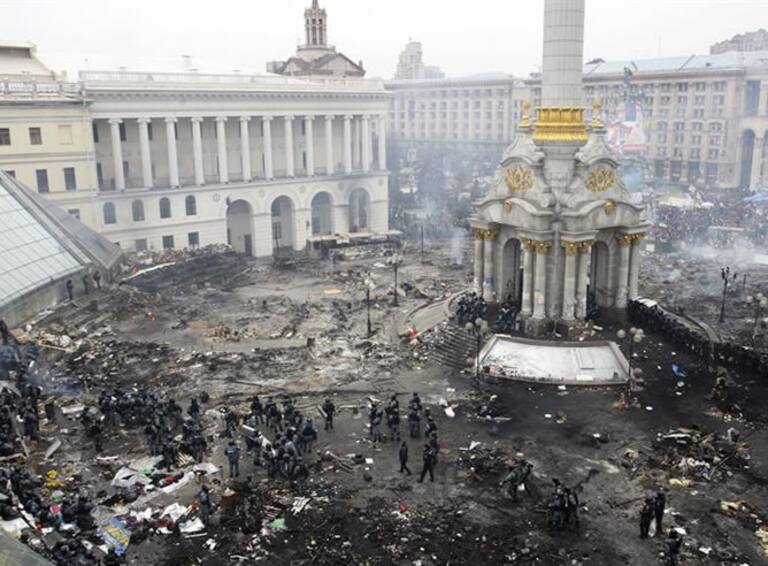 Vista general de la plaza de la Independencia de Kiev, Ucrania, durante los enfrentamientos entre la policía antidisturbios y manifestantes opositores al gobierno hoy, miércoles 19 de febrero de 2014.