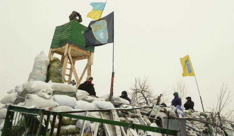 Una barricada que cuenta con una torre de vigilancia, durante una nueva jornada de protestas en el centro de Kiev