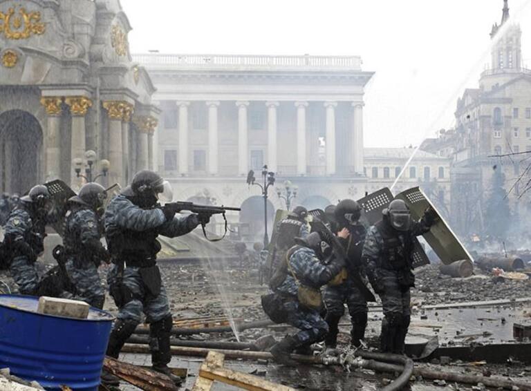 Policías antidisturbios se ponen a cubierto durante los enfrentamientos con manifestantes opositores al gobierno en la plaza de la Independencia de Kiev, Ucrania, hoy, miércoles 19 de febrero de 2014.