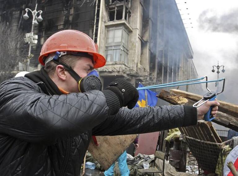 Un manifestante opositor usa un tirachinas durante los enfrentamientos con la policía antidisturbios en el centro de Kiev, Ucrania, hoy, miércoles 19 de febrero de 2014.