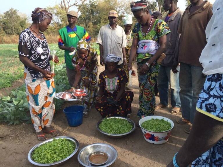 • Mujer embarazada regando un jardín nutricional en Bantakoto