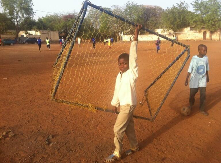 Uno de los niños de Bamako carga una de las porterias del terreno de juego