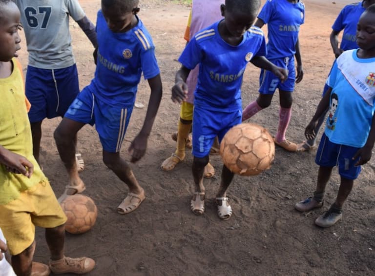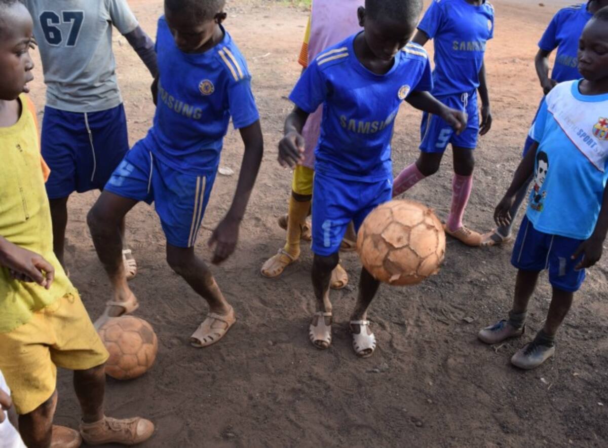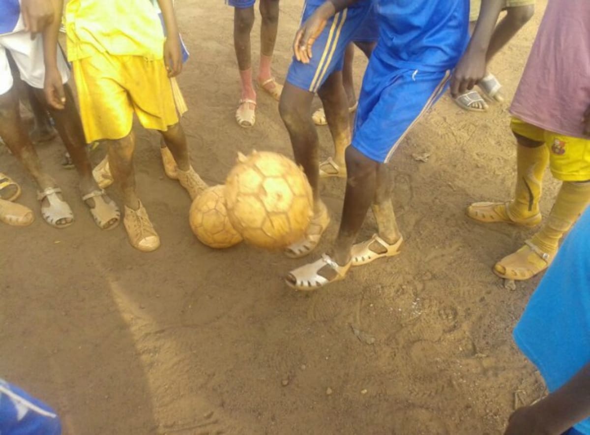 Los niños demuestran su dominio del balón a pesar del calzado que utilizan para jugar al fútbol