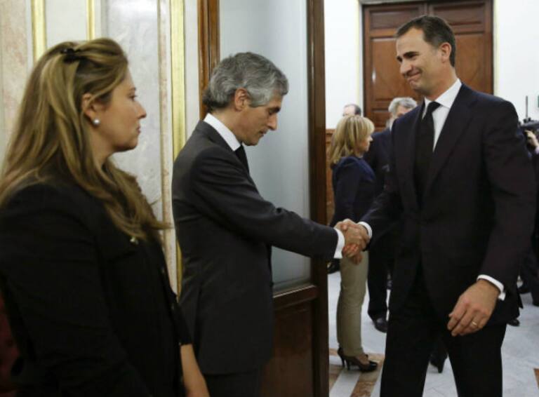 El príncipe Felipe saluda Adolfo Suárez Illana, hijo del expresidente del Gobierno Adolfo Suárez, a su llegada a la capilla ardiente