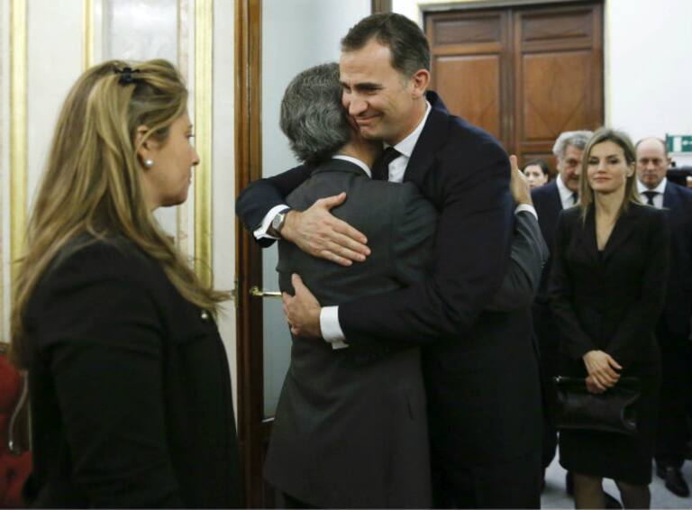El príncipe Felipe abraza a Adolfo Suárez Illana, hijo del expresidente del Gobierno Adolfo Suárez, a su llegada a la capilla ardiente