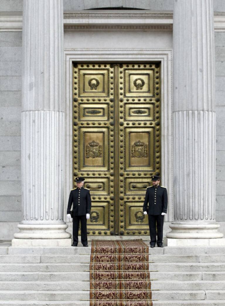 El féretro de Adolfo Suárez, portado por un piquete de honor, ha abandonado el Congreso de los Diputados por la escalinata de la Puerta de los Leones