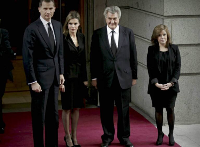 Los príncipes de Asturias, Felipe y Leticia, posan junto al presidente del Congreso, Jesús Posada, y la vicepresidenta del Gobierno, Soraya Sáenz Santamaría, a su llegada a la capilla ardiente