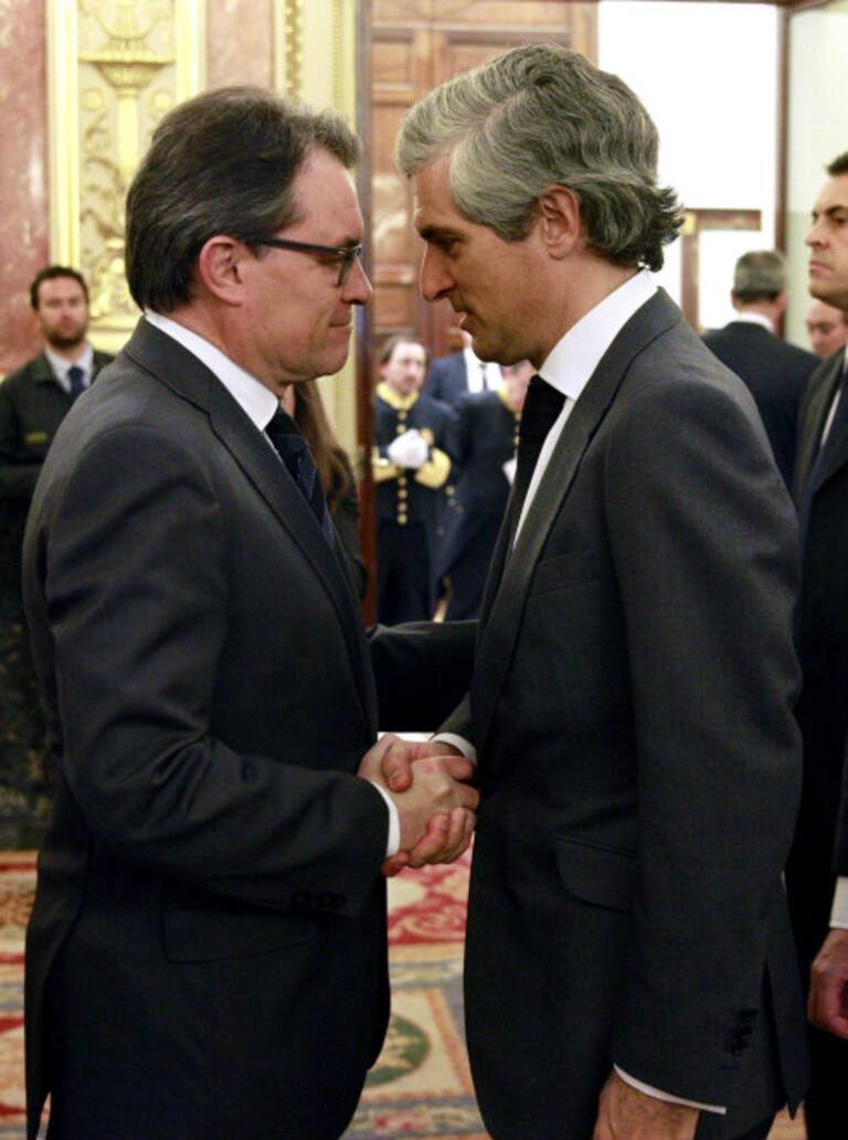 El presidente de la Generalitat de Cataluña, Artur Mas, da el pésame a Adolfo Suárez Illana, en la capilla de su padre
