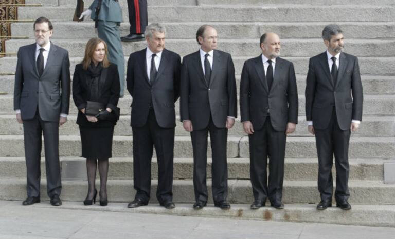 El presidente del Gobierno, Mariano Rajoy, su esposa, Elvira Fernández, Los presidentes del Congreso y el Senado, Jesús Posada y Pío García Escudero, respectivamente y los titulares del Tribunal Constitucional, Francisco Pérez de los Cobos, y del Consejo
