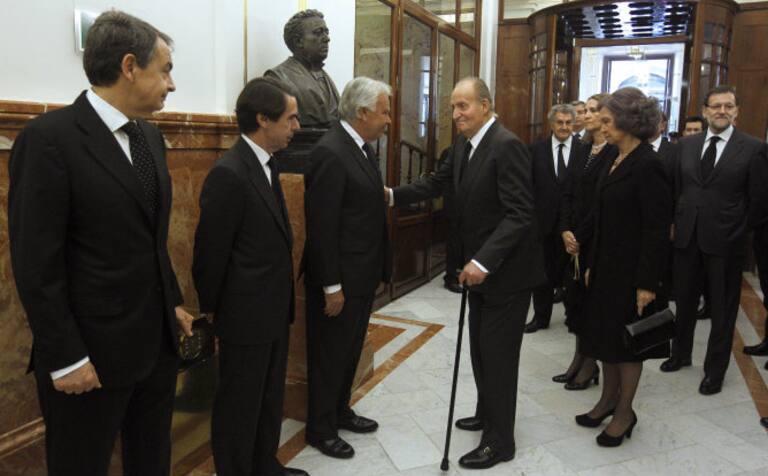 Los expresidentes del Gobierno, Felipe González, José María Aznar, José Luís Rodríguez Zapatero y su esposa Sonsoles Espinosa, esperan en las escalinatas del Congreso la llegada del féretro
