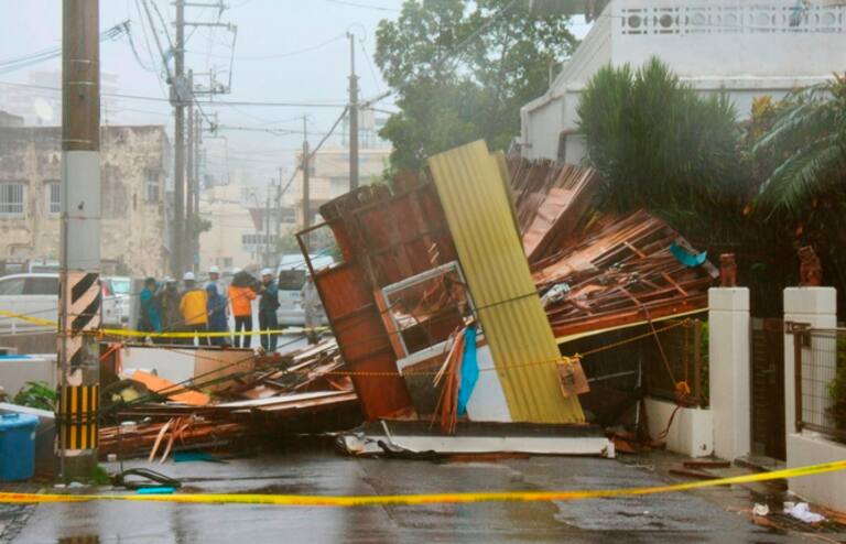 Una casa aparece derribada en una de las calles dela isla de Okinawa.