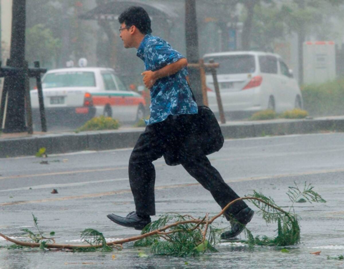 Un hombre intenta resguardarse de la lluvia y el fuerte viento en la isla de Okinawa.