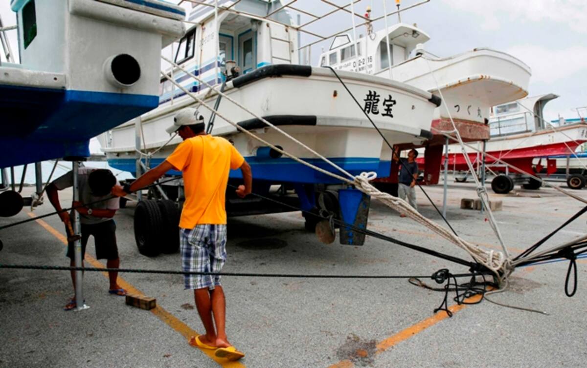 Un hombre amarra su barco ante la llegada de Neoguri