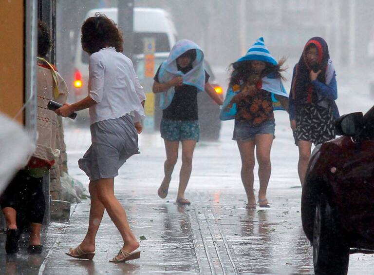 Varias mujeres corren por las callles de Okinawa para resguardarse del tifón.