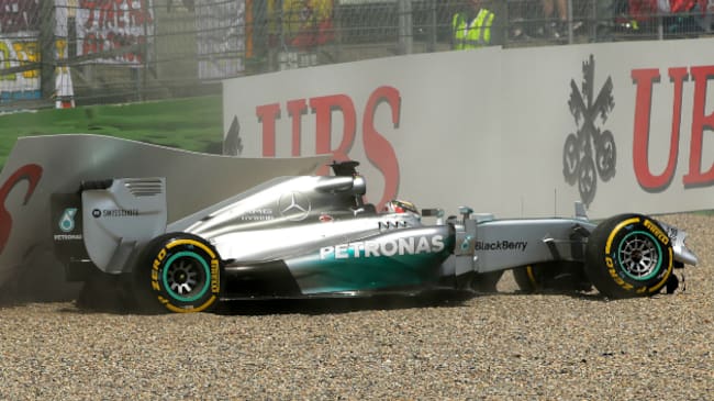 Hamilton -campeón del mundo en 2008, con McLaren-, perdió el control de su coche, al romper el disco delantero derecho de sus frenos, en la zona del estadio, donde se estrelló contra los neumáticos de protección, sin sufrir daños importantes; aunque no salió en la Q2 y mañana arrancará decimoquinto.