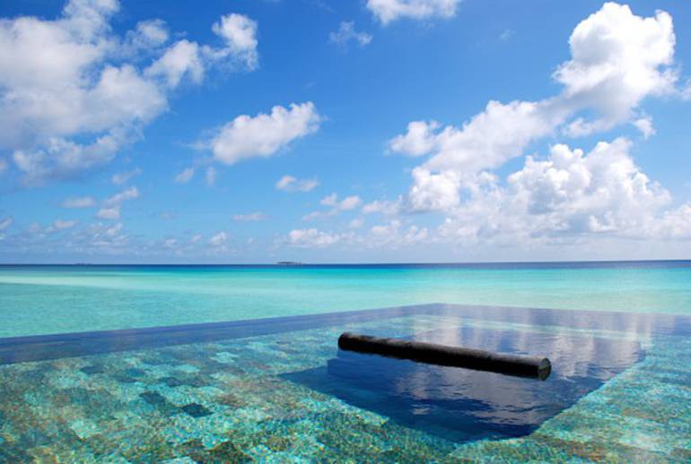 Una piscina dentro de otra piscina que se cuelga prácticamente sobre el mar más cristalino que te puedas imaginar. Sucede en uno de lujosísimos hoteles de las islas Maldivas, el exclusivo One&Only Reethi Rah.