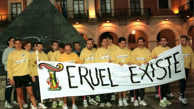 Fotografía de archivo de la campaña 'Teruel existe' en la que los miembros del club de Atletismo Mudéjar de Teruel, posan en la plaza de San Juan.(EFE)