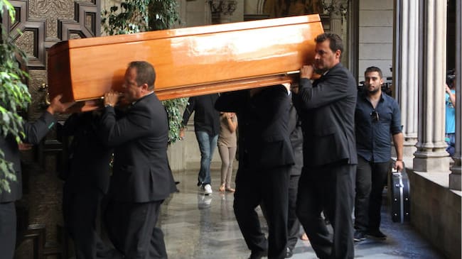 El féretro con los restos mortales de Peret llega al Saló de Cent del Ayuntamiento de Barcelona(EFE TONI GARRIGA)
