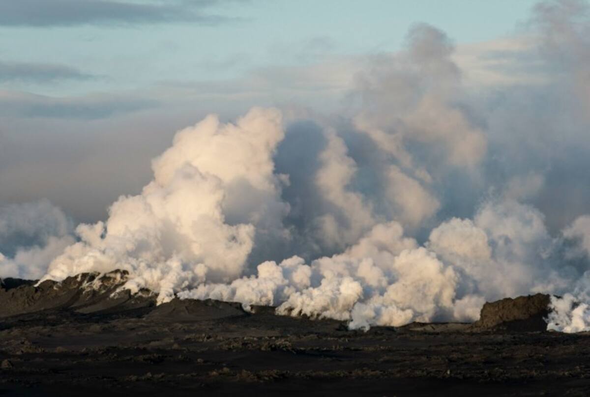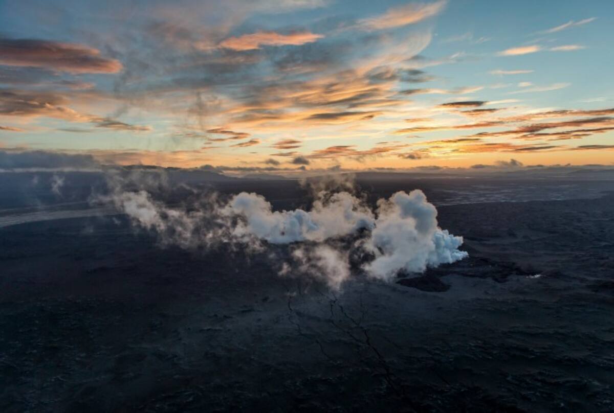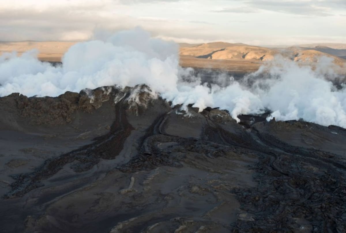 Vista aérea de unas nubes de humo y vapor saliendo de una fisura en una zona cubierta por lava al norte del glacial Vatnajokull en Islandia.