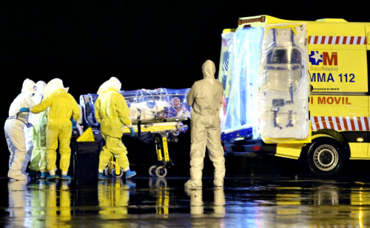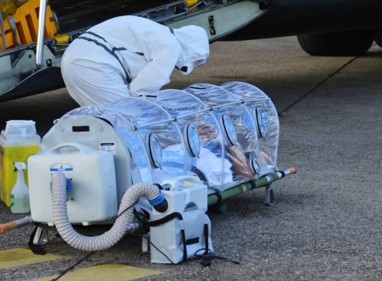 Personal médico atendiéndo a Manuel García Viejo en el aeropuerto de Freetown