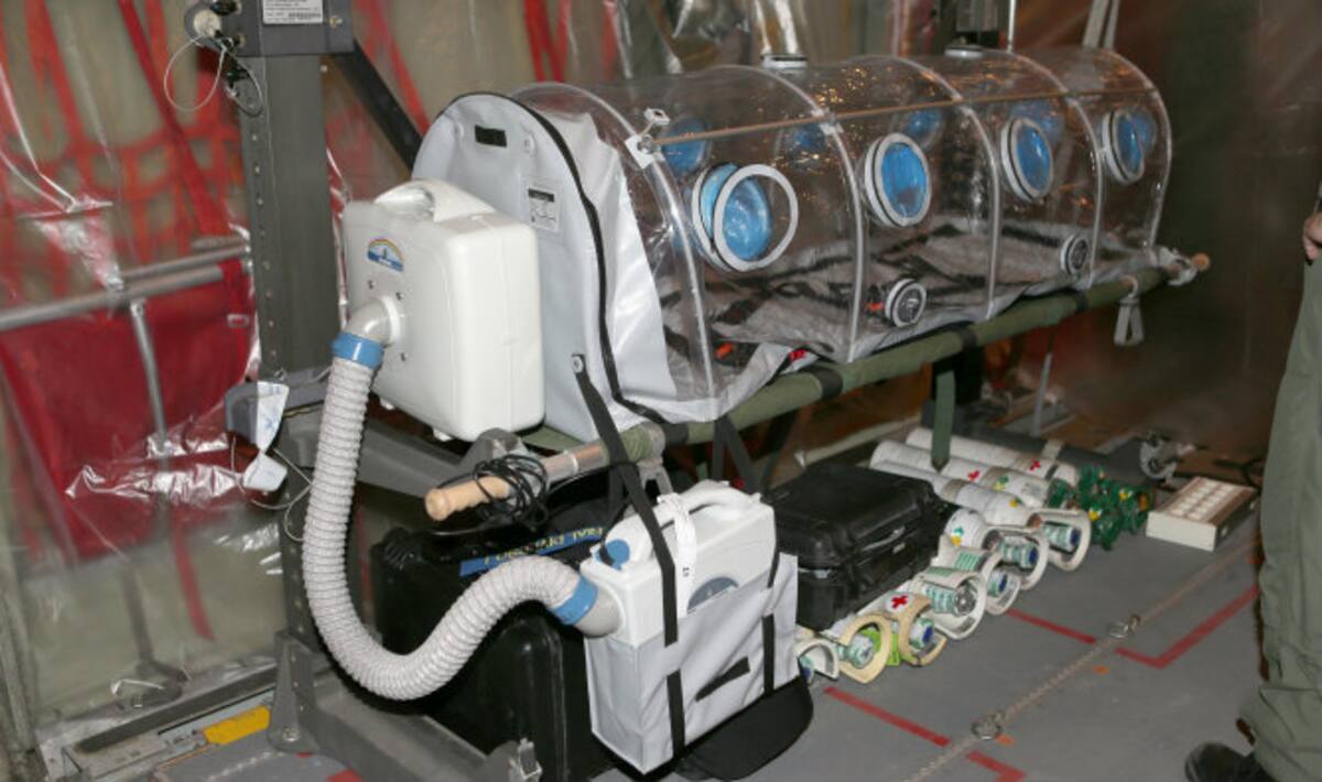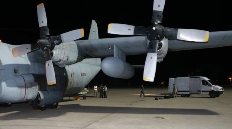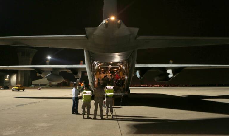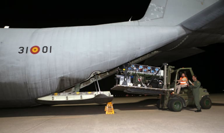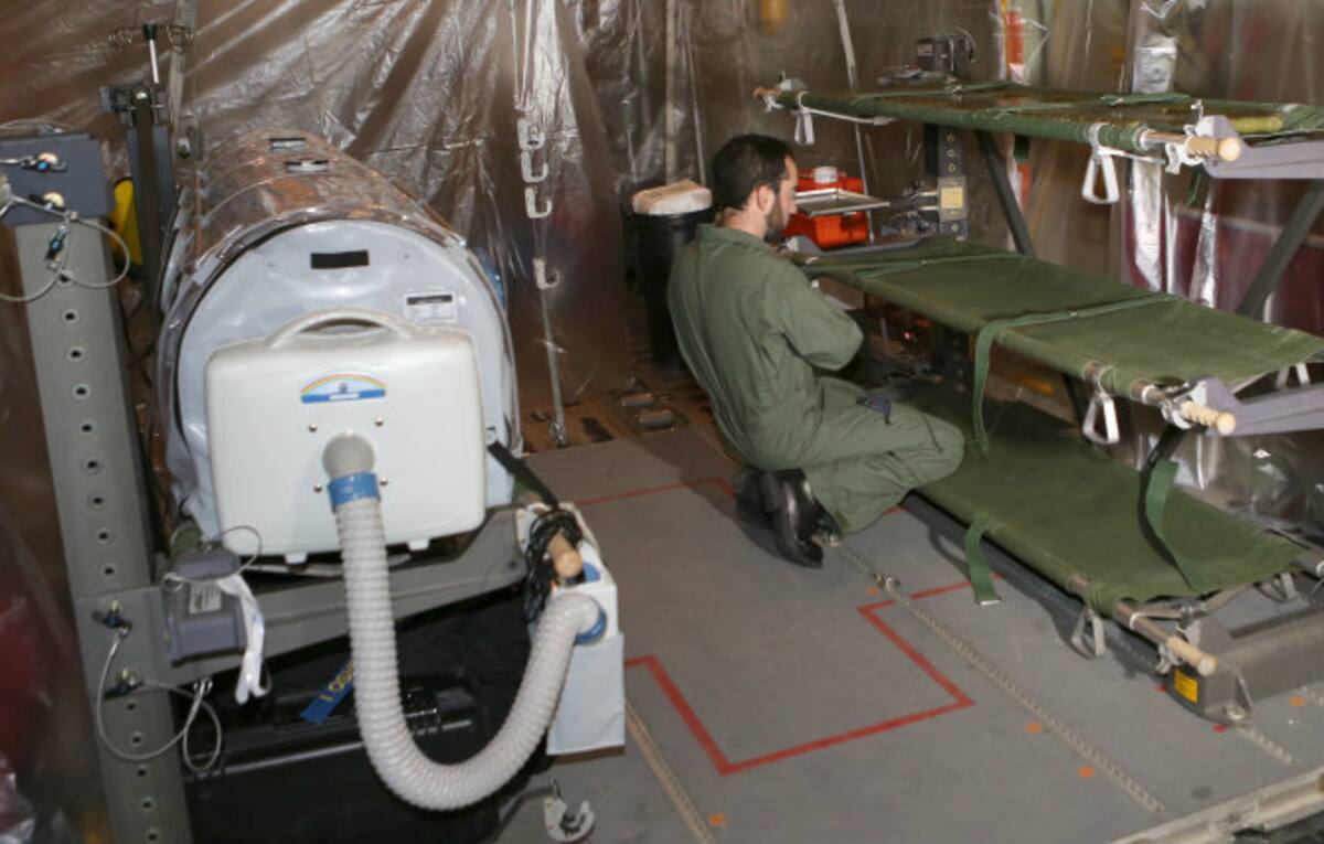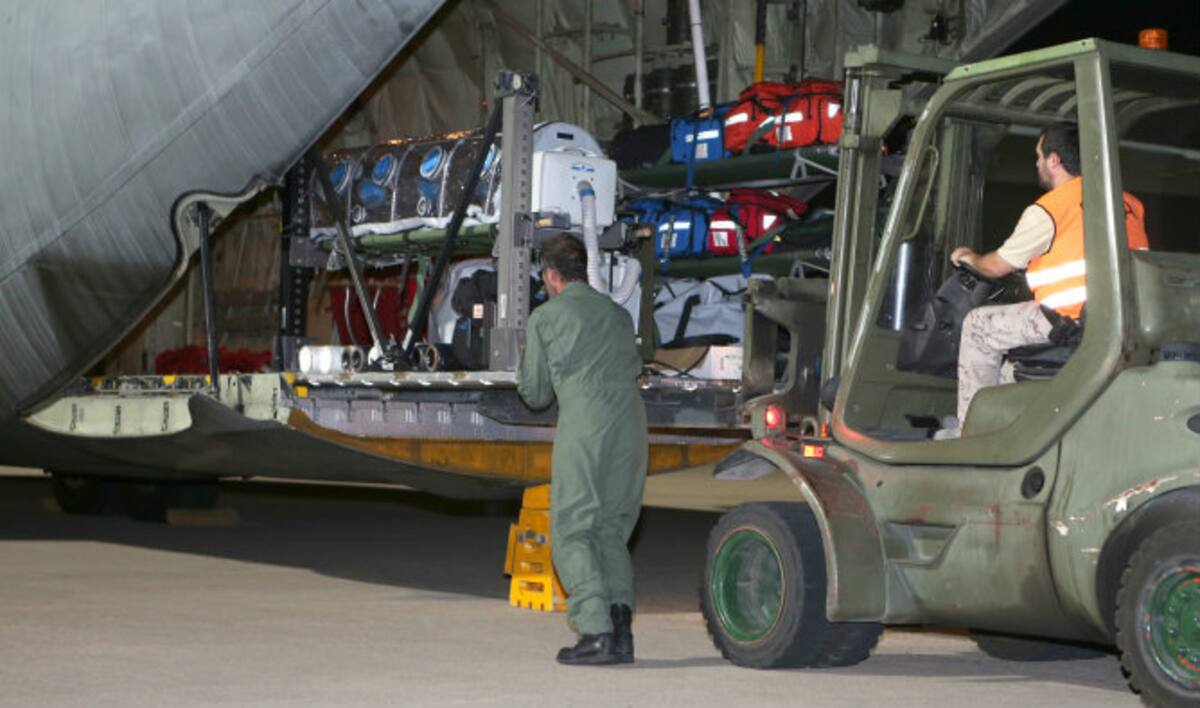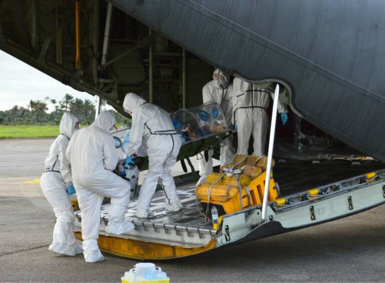 Personal médico subiendo al enfermo de ébola Manuel García al avión hercules en el aeropuerto de Freetown
