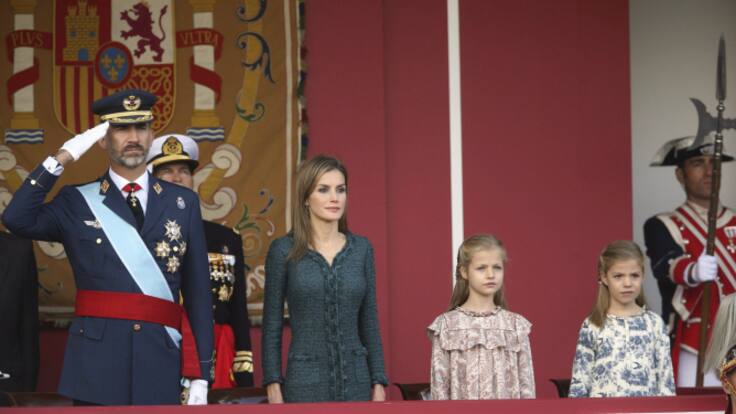 Don Felipe y doña Letizia presiden por primera vez como Reyes, el desfile militar de la Fiesta Nacional, al que han acudido acompañados por la princesa de Asturias y la infanta Sofía.