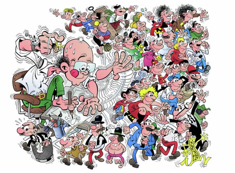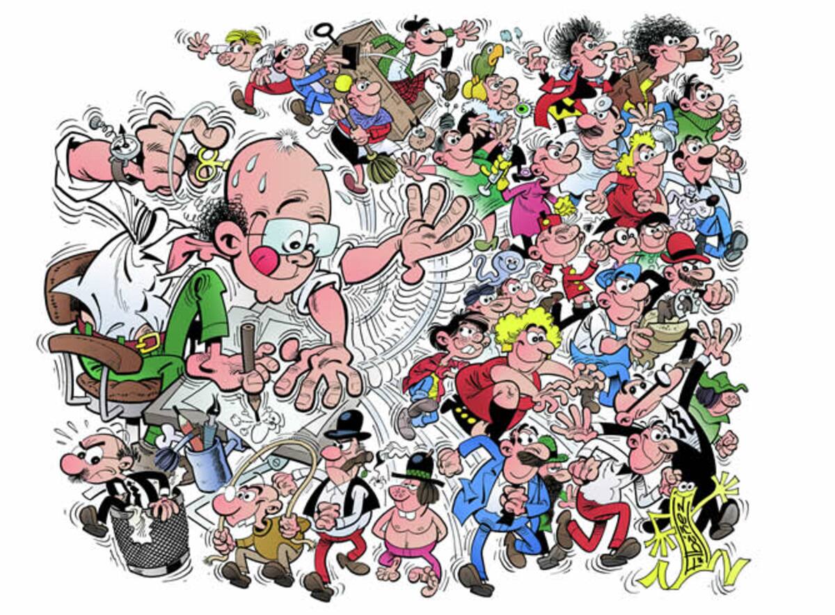 Francisco Ibáñez rodeado de los personajes creados en la etapa en la que trabajó para la editorial Bruguera, desde 1958 hasta la actualidad.