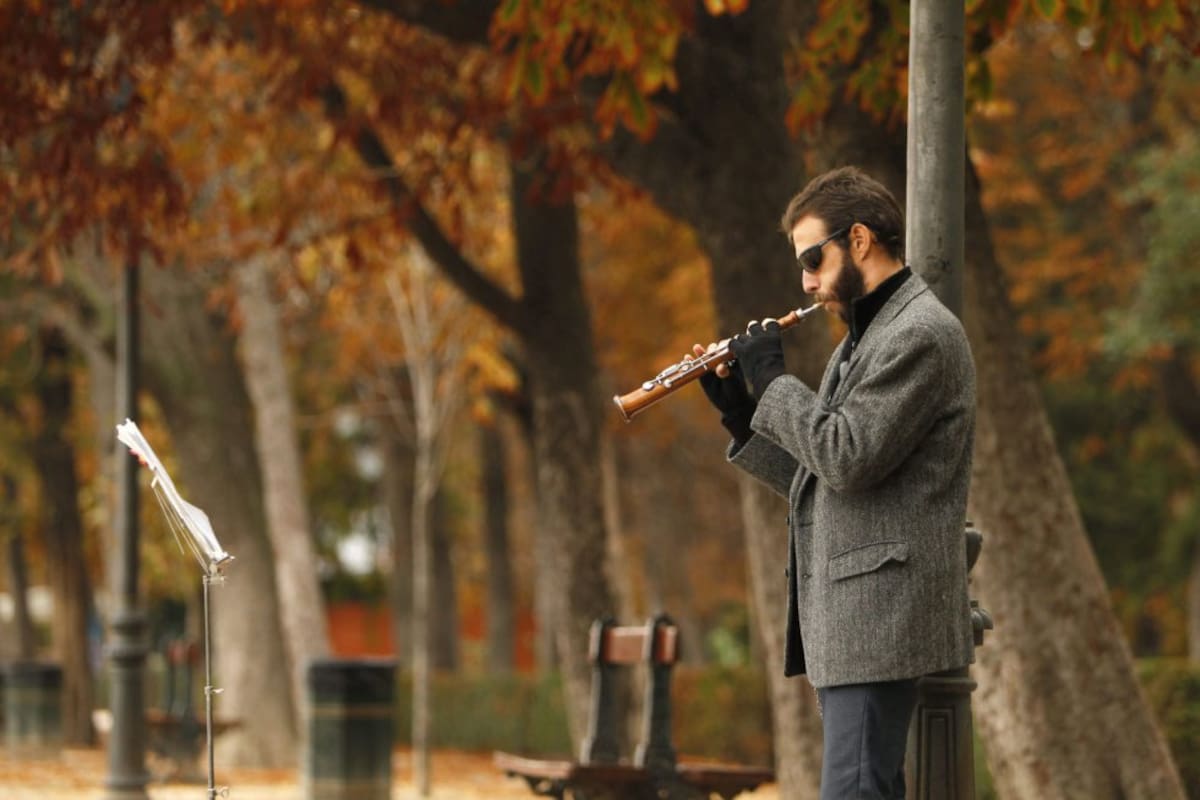 Un músico toca la flauta durante una tarde de Otoño en el Parque del Retiro, hoy en Madrid. El brusco cambio en la situación atmosférica, con cielos cubiertos y bajada generalizada de temperaturas, ha puesto punto y final al veranillo que hemos disfrutado