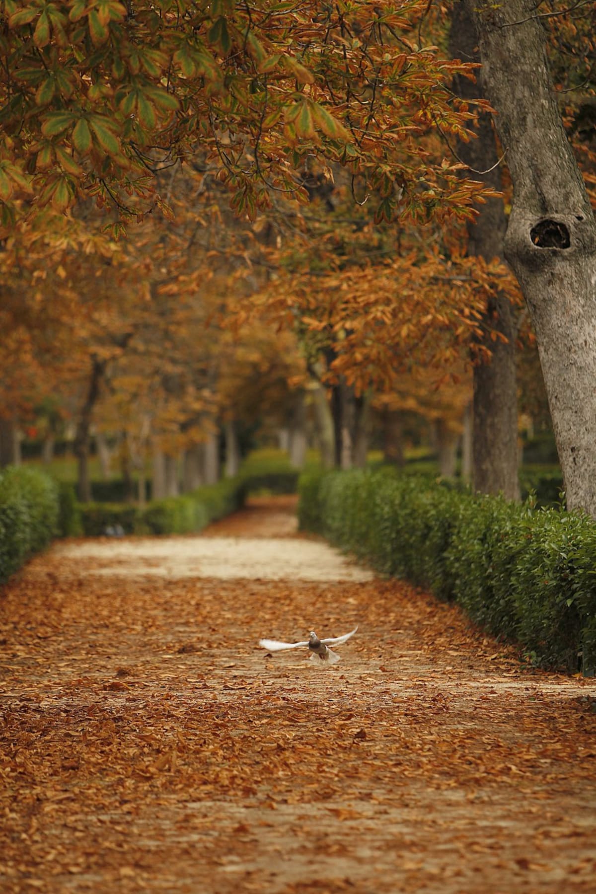 Una paloma emprende el vuelo durante una tarde de Otoño en el Parque del Retiro, hoy en Madrid. El brusco cambio en la situación atmosférica, con cielos cubiertos y bajada generalizada de temperaturas, ha puesto punto y final al veranillo que hemos disfru