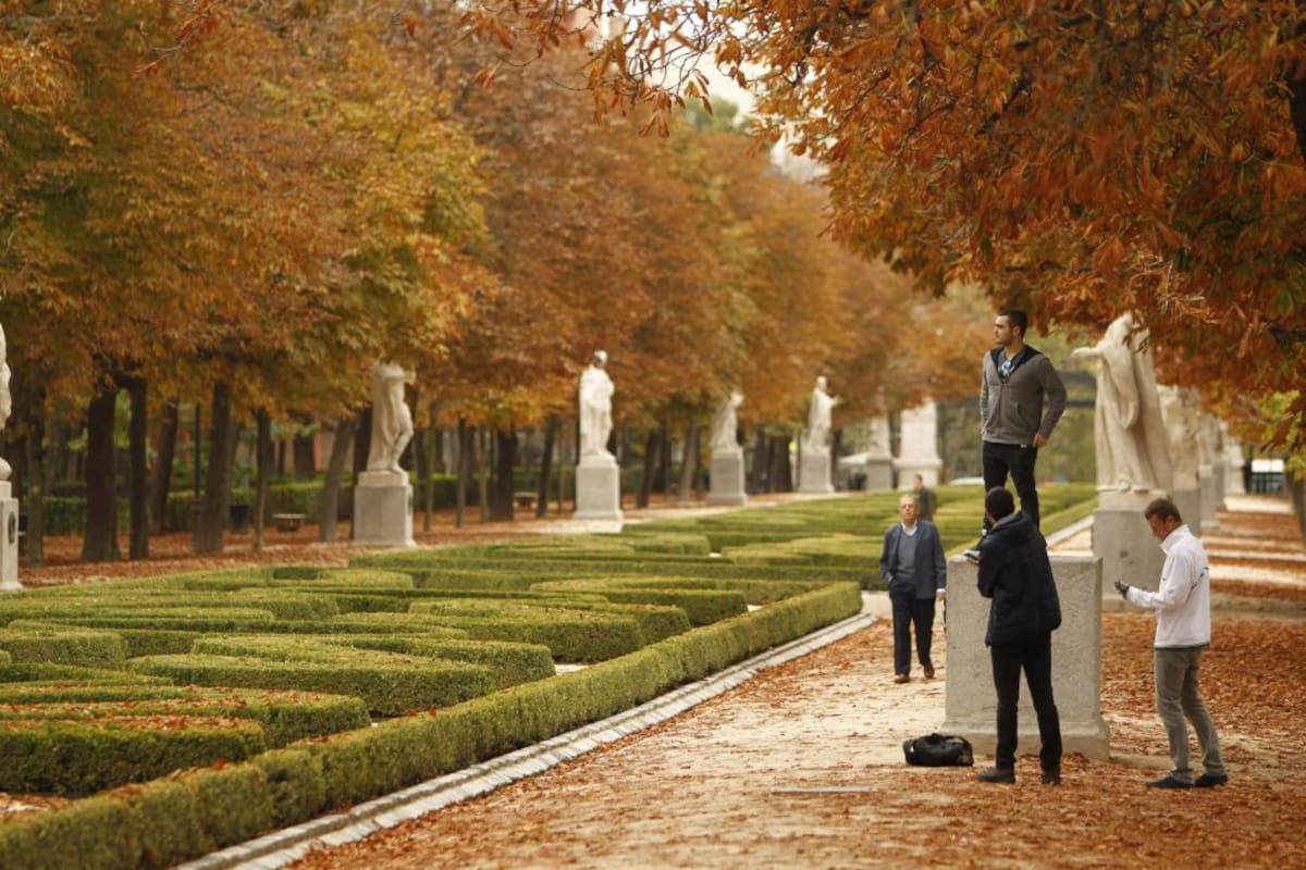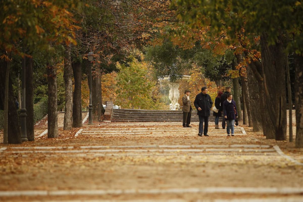 Varias personas caminan por un camino durante una tarde de Otoño en el Parque del Retiro, hoy en Madrid. El brusco cambio en la situación atmosférica, con cielos cubiertos y bajada generalizada de temperaturas, ha puesto punto y final al veranillo que hem