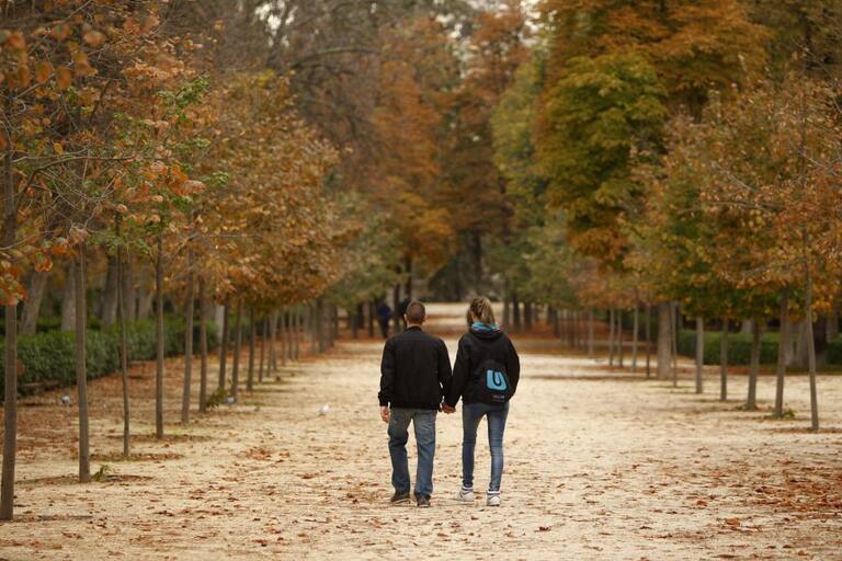 Una pareja pasea durante una tarde de Otoño en el Parque del Retiro, hoy en Madrid. El brusco cambio en la situación atmosférica, con cielos cubiertos y bajada generalizada de temperaturas, ha puesto punto y final al veranillo que hemos disfrutado en las