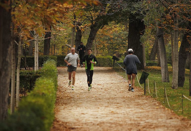 Varias personas corren por un camino durante una tarde de Otoño en el Parque del Retiro, hoy en Madrid. El brusco cambio en la situación atmosférica, con cielos cubiertos y bajada generalizada de temperaturas, ha puesto punto y final al veranillo que hemo