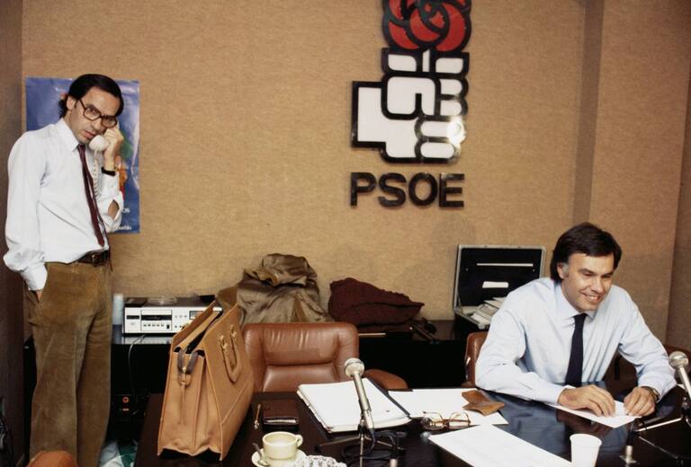 Felipe Gonzalez junto a Alfonso Guerra en la sede central del PSOE tras haber ganado las elecciones generales de 1982.