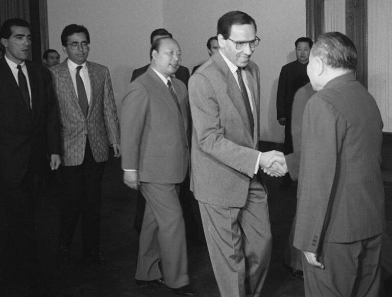 Pekín (China), 30-4-1987. El exvicepresidente del gobierno español, Alfonso Guerra, saluda al que fuera máximo dirigente chino, Deng Xiaoping en uno de los salones del Gran Palacio del pueblo de Pekín. Guerra viaja acompañado del responsable de área del P