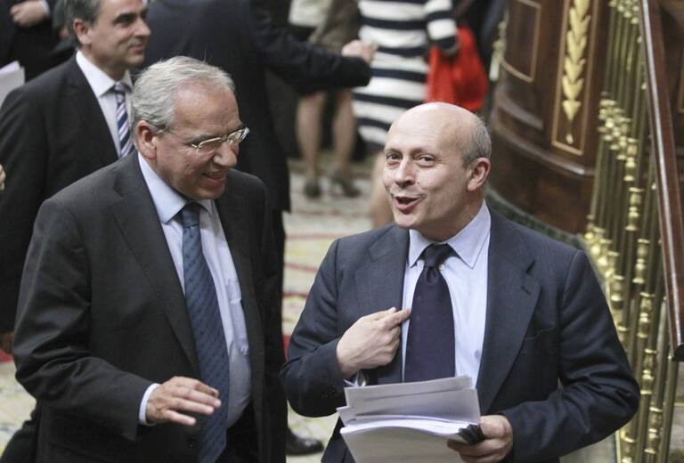 Madrid, 22/05/2012.- El ministro de Educación, José Ignacio Wert, conversa con el diputado socialista Alfonso Guerra tras finalizar el pleno del Congreso, donde se continuó con el trámite sobre los presupuestos generales del Estado, con el debate del dict