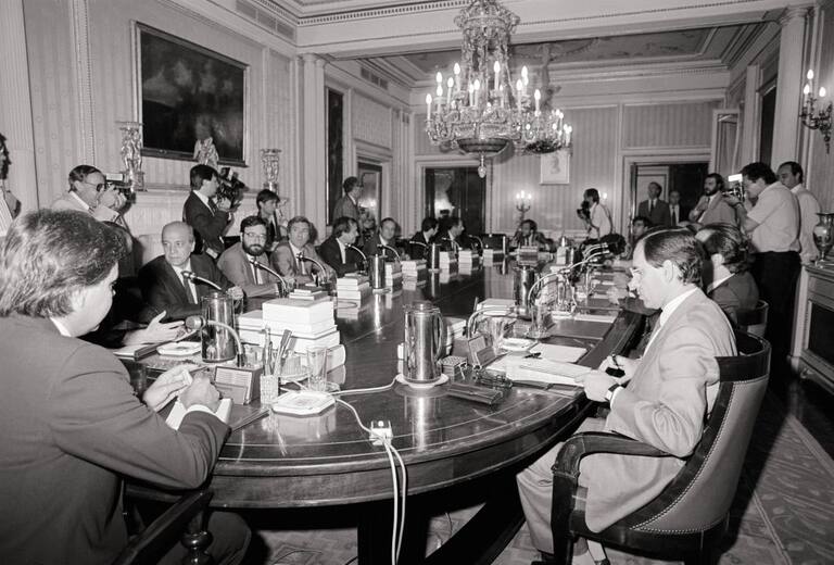 Reunión de gabinete. Felipe Gonzalez, expresidente del Gobierno, con el exvicepresidente, Alfonso Guerra, y el resto de ministros en la mesa.