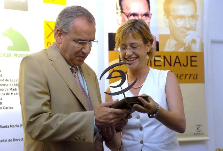 Madrid, 12.06.05.- El socialista Alfonso Guerra recibe de manos de Pilar Cortés, de la editorial Espasa, un recuerdo en el homenaje tributado en la Feria del Libro de Madrid en reconocimiento a su trayectoria editorial, que contó con la participación de F