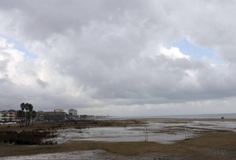 Aspecto de la playa de Comarruga (Tarragona) hoy, inundada a causa del temporal de lluvia, viento y mala mar que ha comenzado a llegar a Cataluña y permanecerá activo hasta el próximo lunes día 1 de diciembre.
