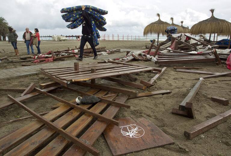 Varios trabajadores del chiringuito Copacabana retiran hamacas y colchonetas destrozadas tras los fuertes vientos y la lluvia que se han registrado esta mañana en Torremolinos (Málaga) y en la capital de la Costa del Sol, donde han causado daños en más de