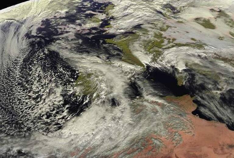 Imagen tomada por el satélite Meteosat para la Agencia Estatal de Meteorología que prevé para este sábado, precipitaciones fuertes y/o persistentes en gran parte de España que, en Canarias, irán acompañadas de fuertes vientos.