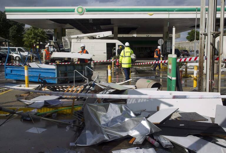 Empleados de una gasolinera retiran los desperfectos causados tras los fuertes vientos y la lluvia que se han registrado esta mañana en Málaga, donde han causado daños en más de una veintena de vehículos, han arrancado más de 30 árboles de raíz y han dest