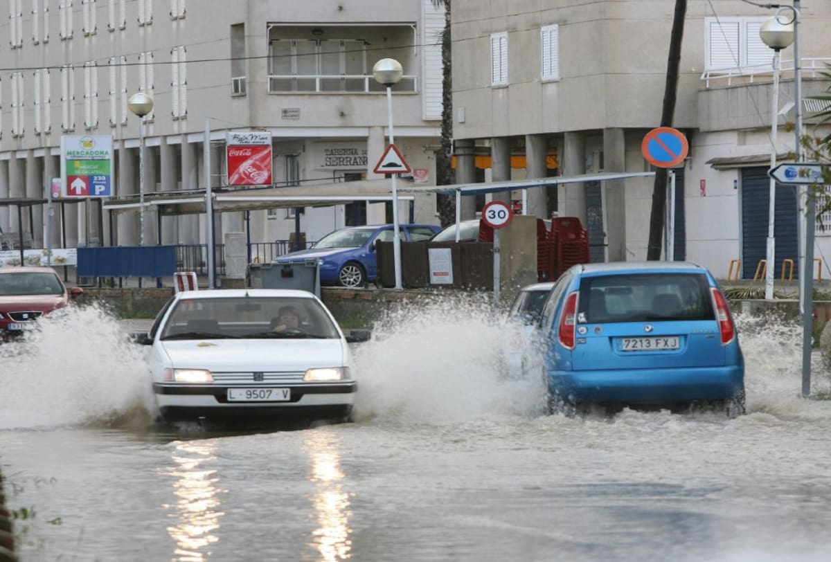 Aspecto de una calle de Calafell (Tarragona) hoy, inundada a causa del temporal de lluvia, viento y mala mar que ha comenzado a llegar a Cataluña y permanecerá activo hasta el próximo lunes día 1 de diciembre.