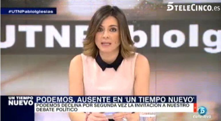 "Podemos no ha querido estar esta noche aquí por segunda semana. Lo que dijo Pablo Iglesias en TVE fue una versión sesgada de lo que ocurrió". Fueron las palabras en directo de Sandra Barneda, conductora de 'Un tiempo nuevo' que, de nuevo, desmentía la versión de Podemos.